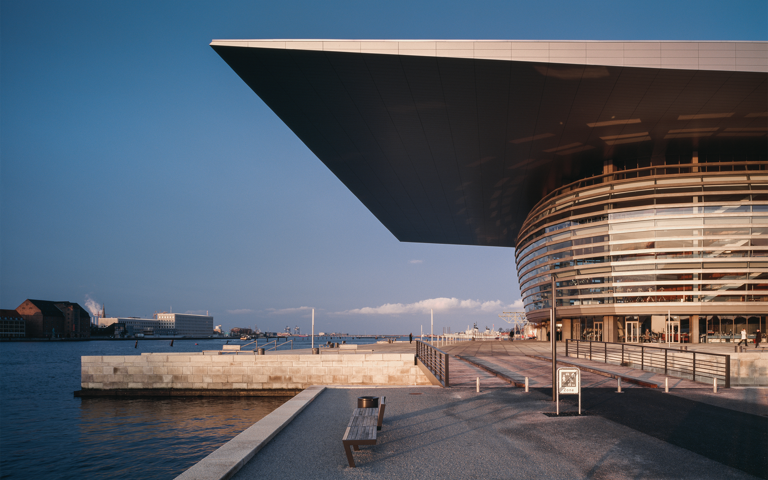 Foran Operaen er anlagt en 35 m bred forplads ud til kajen. Der er udgravet 17 m brede kanaler på hver side af Operaen, som således er placeret på sin egen ø.