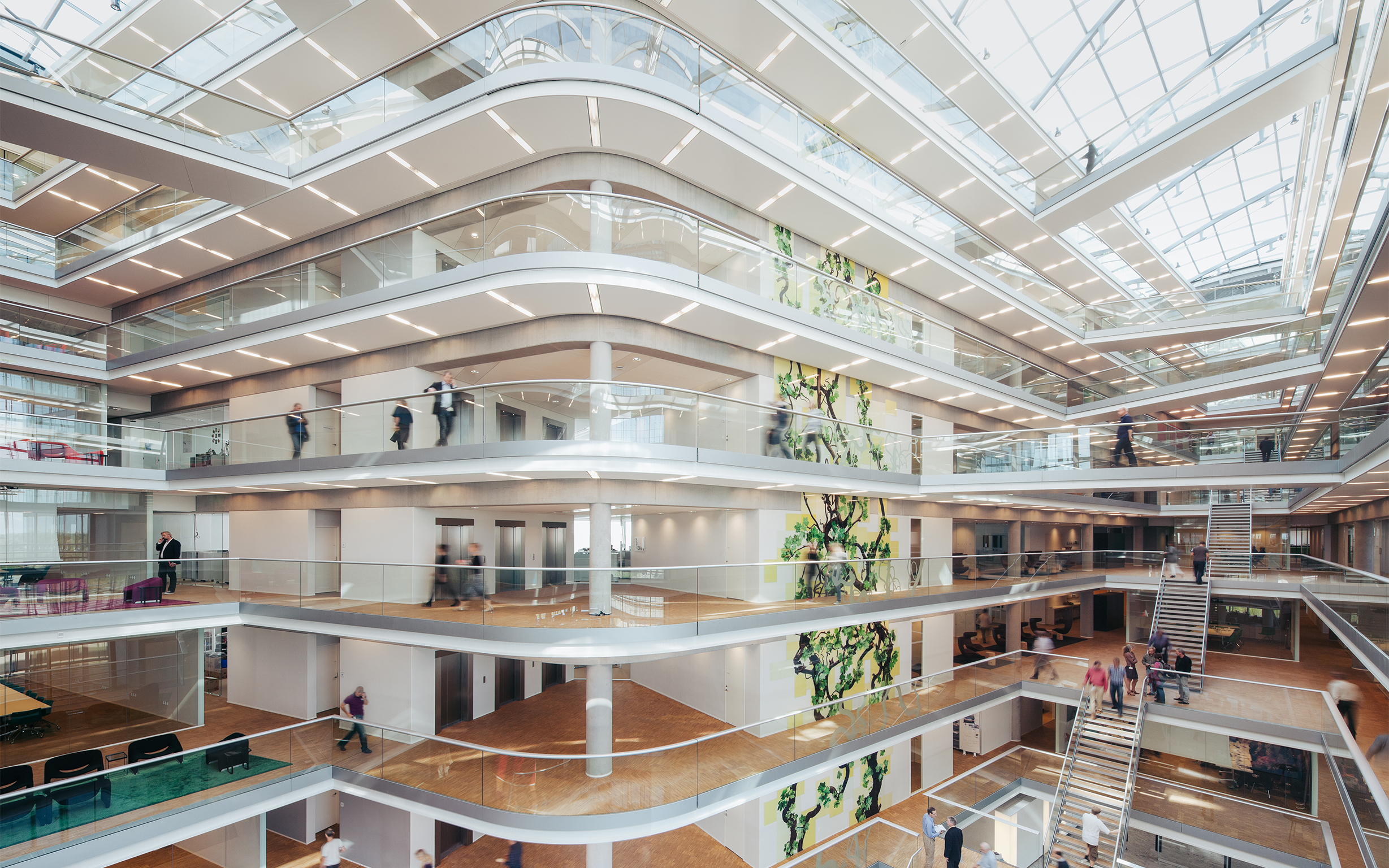 Over husets centrale atrium er der et 1.200 m² stort ovenlys med et spænd på 11 m. Søjle- og bjælkekonstruktionen er med stabiliserende kerner i efterspændte betonelementer.
